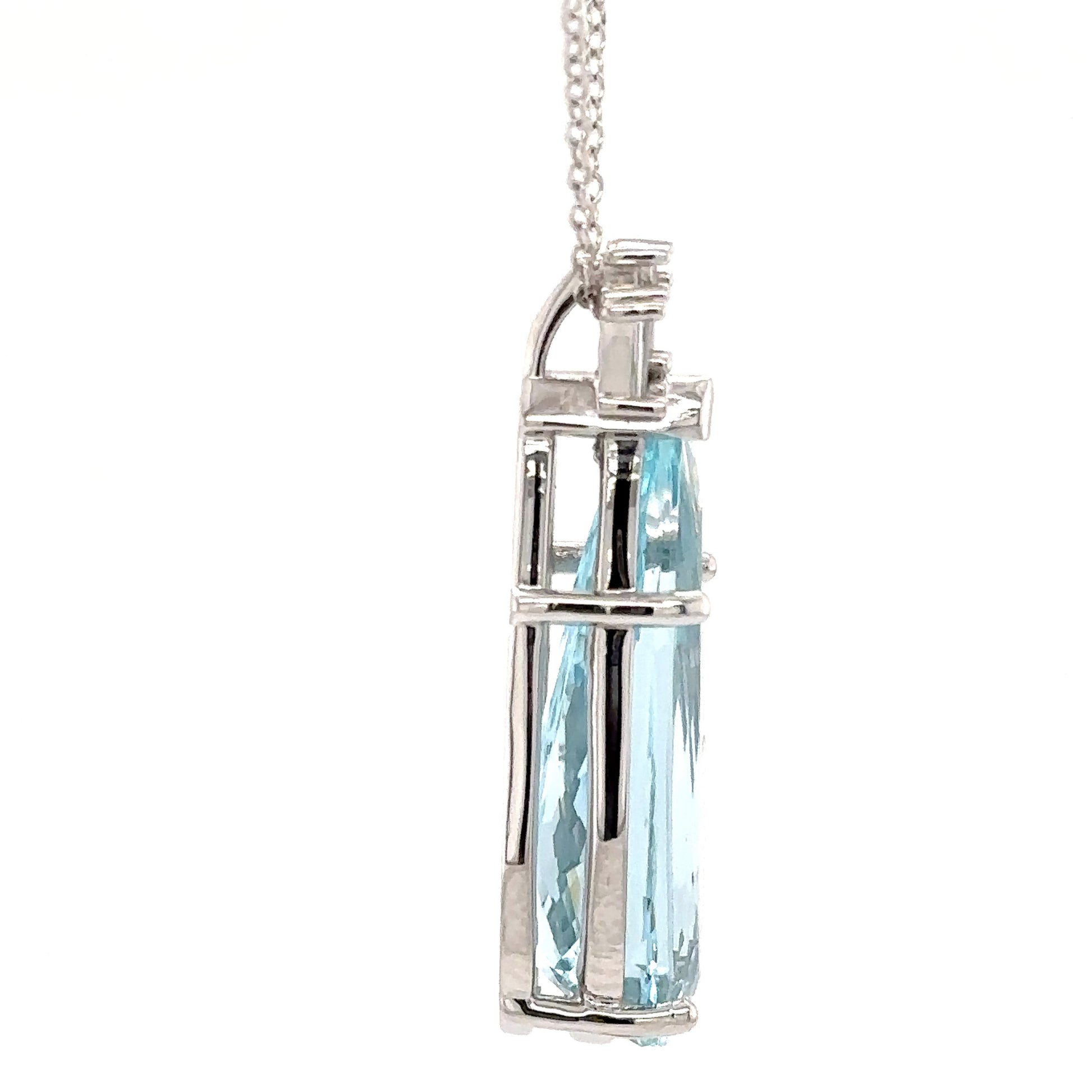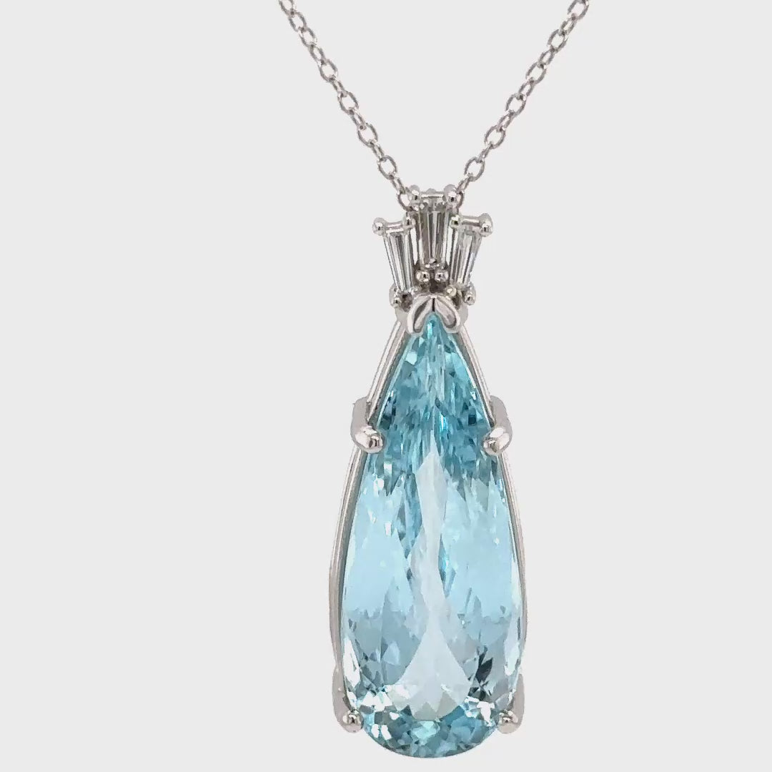 This stunning aquamarine pendant necklace features a beautifully cut teardrop gemstone, radiating a serene blue hue. Crafted with precision, the pendant is elegantly suspended from a delicate chain.