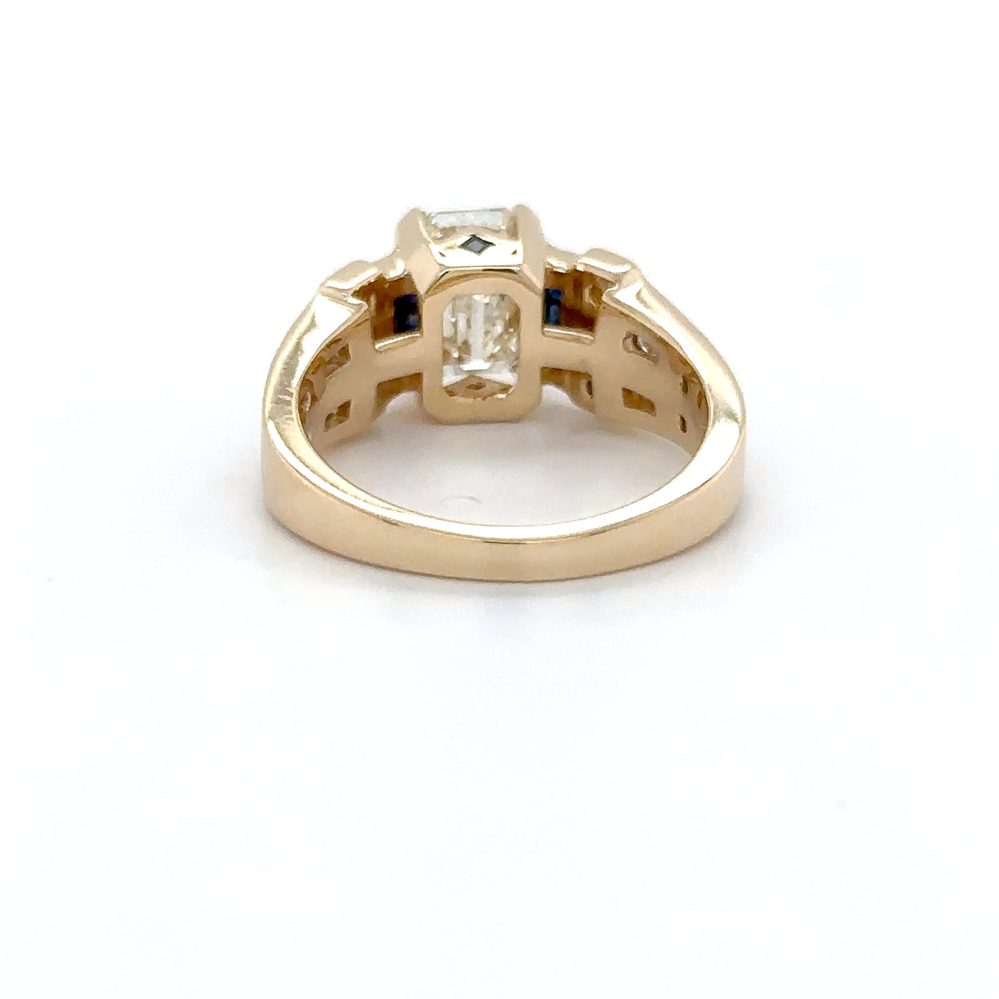 A stunning emerald cut diamond complimented by unique shaped diamonds and deep blue sapphires.