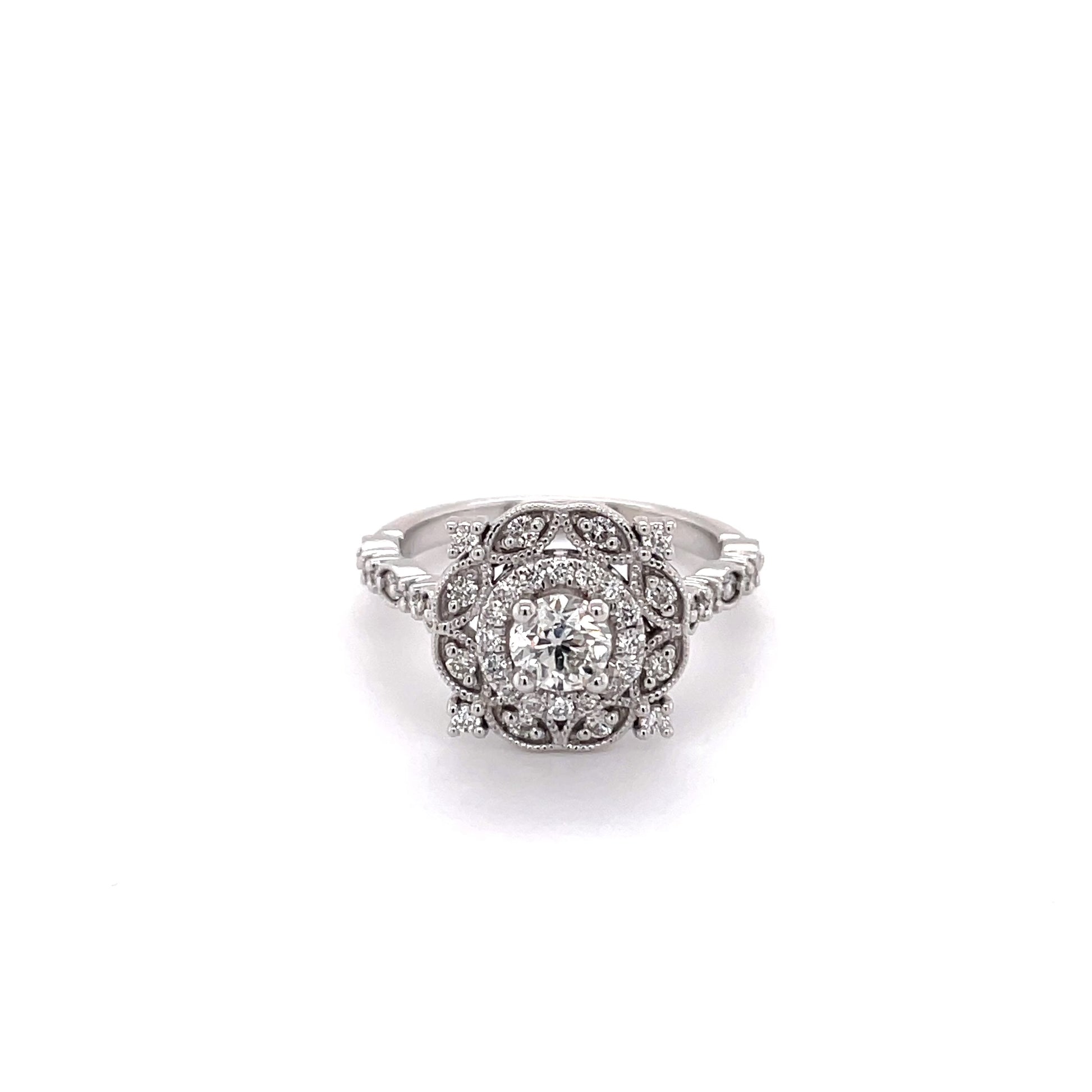 Antique style floral design with delicate milgrain around round white diamonds. Set in white gold.