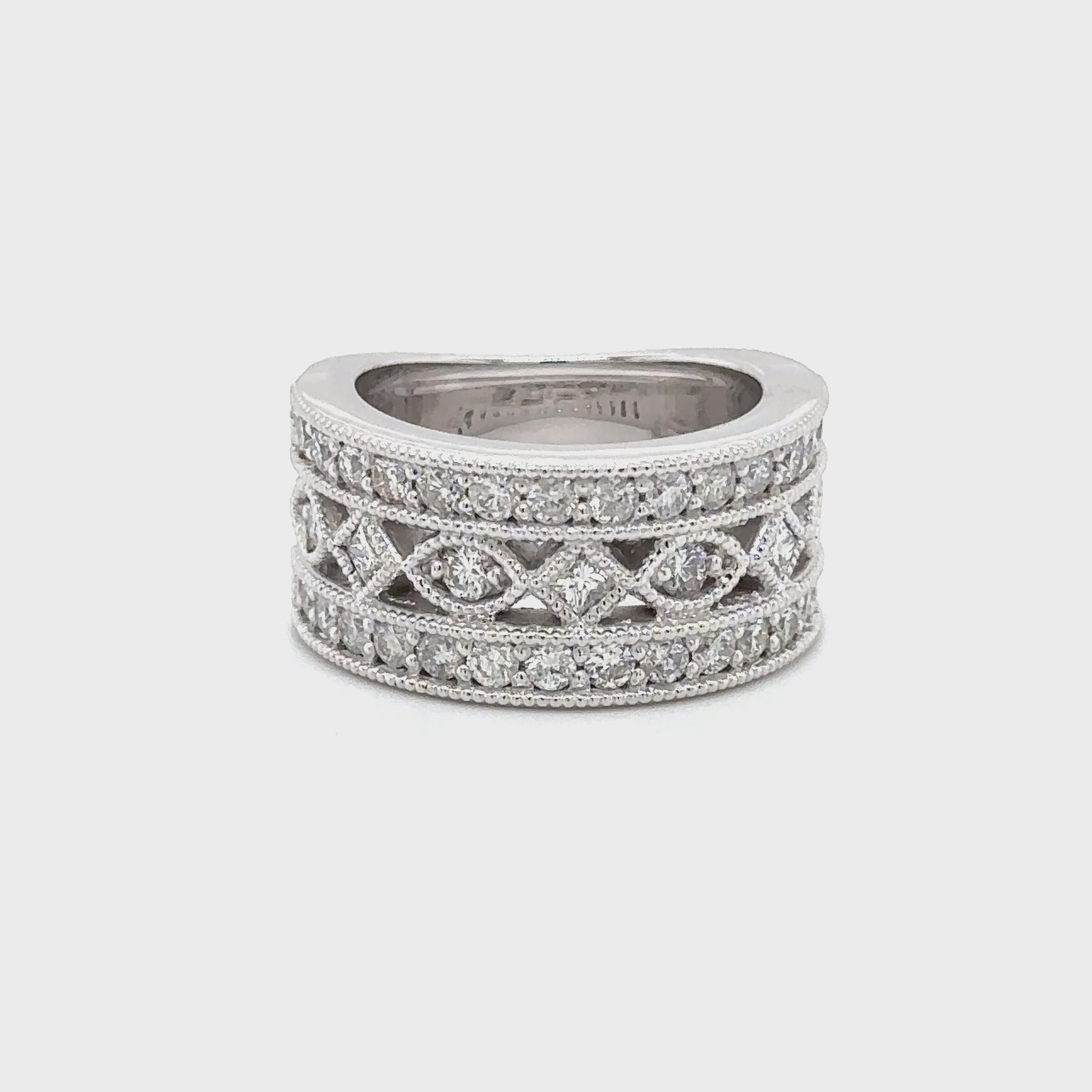 An expertly crafted wide band with round and princess cut diamonds and milgrain detail.