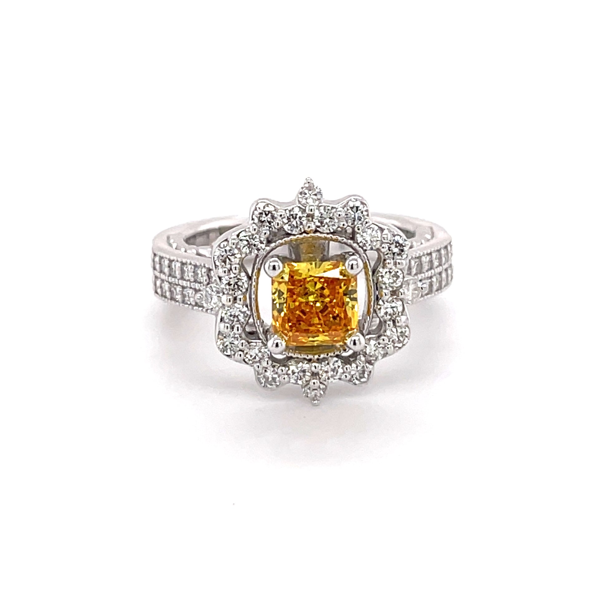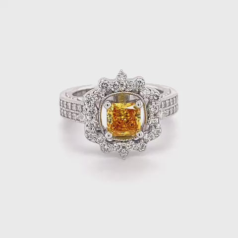 A rich deep yellow diamond is captured around a white diamond halo for that perfect antique style engagement ring.