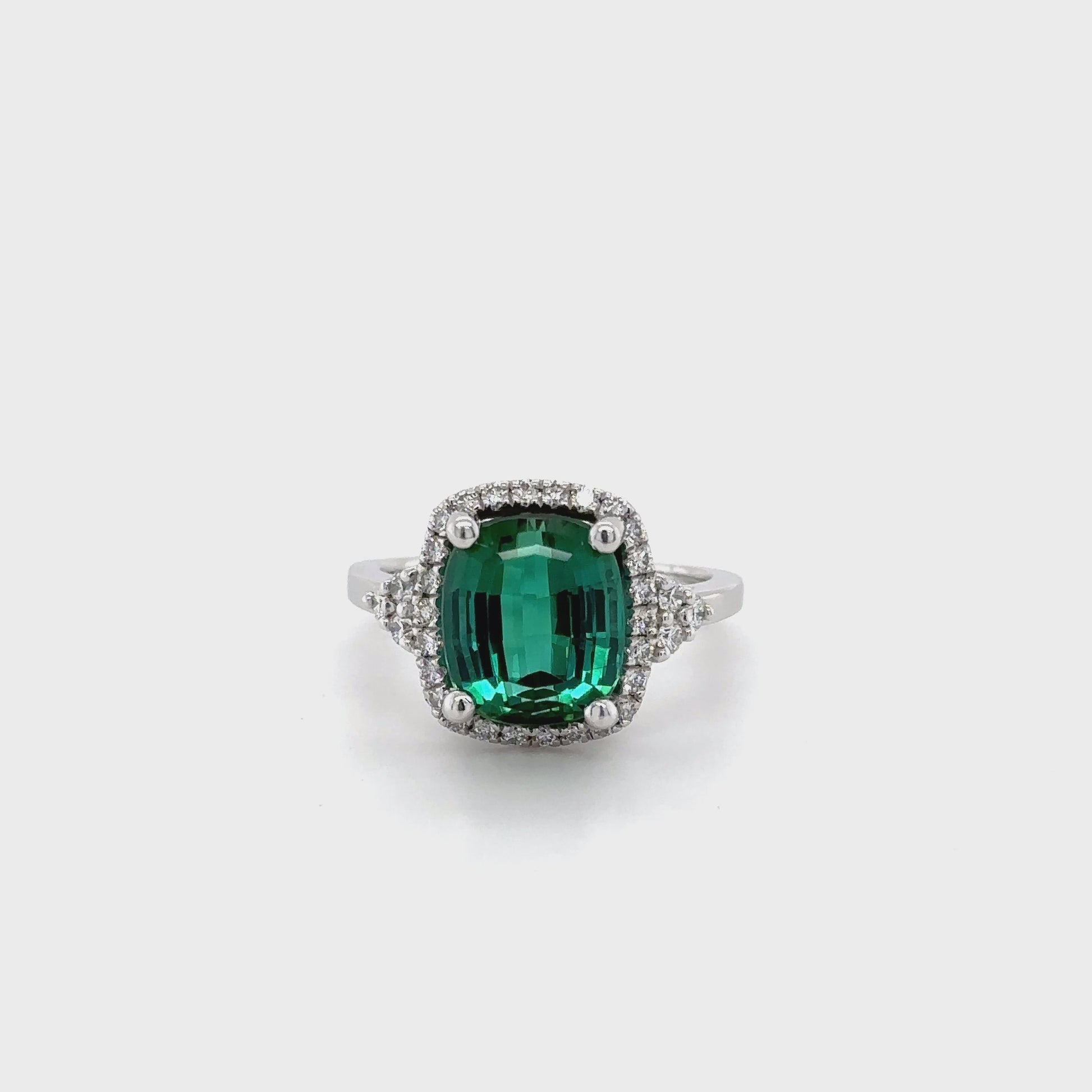Elegant and eye-catching green tourmaline with a sparkling diamond halo.