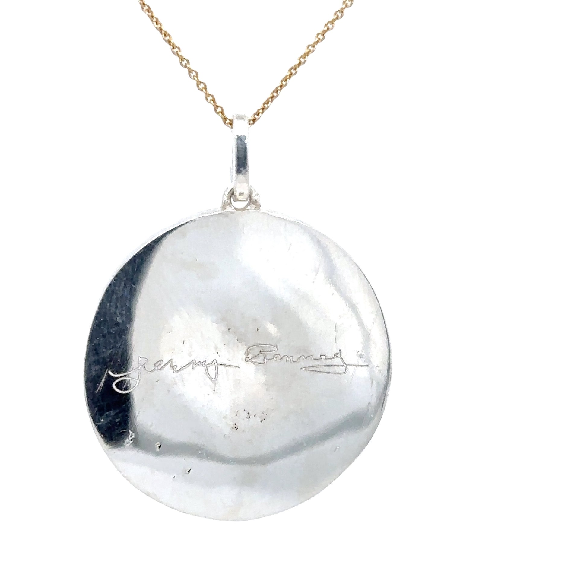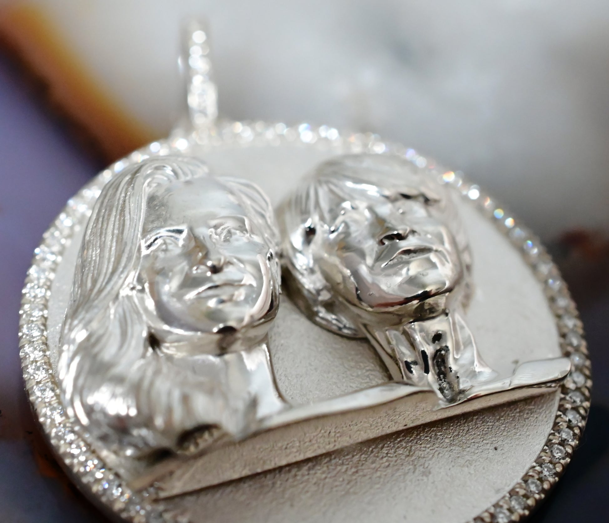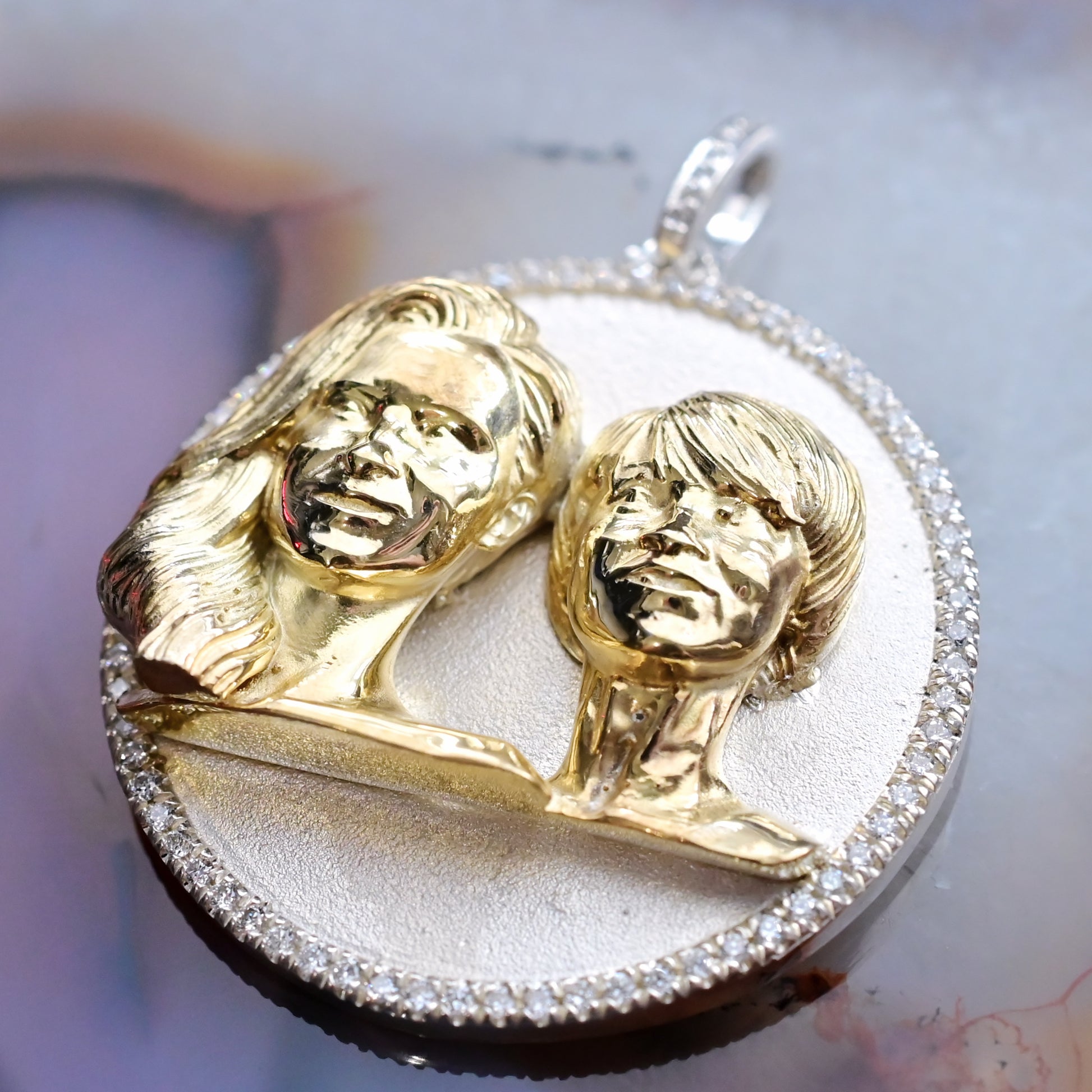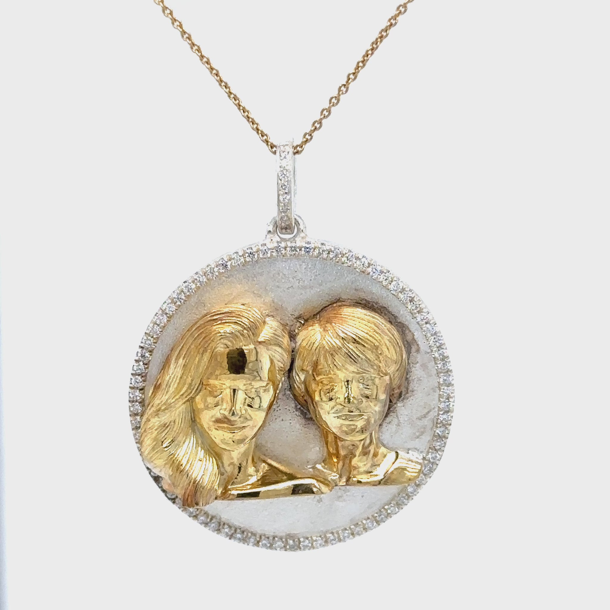 For everlasting memories. We created this beautiful two tone Mother and Daughter portrait pendant from a photograph. Sterling silver with gold plating, pave diamonds and a Sterling Silver chain.