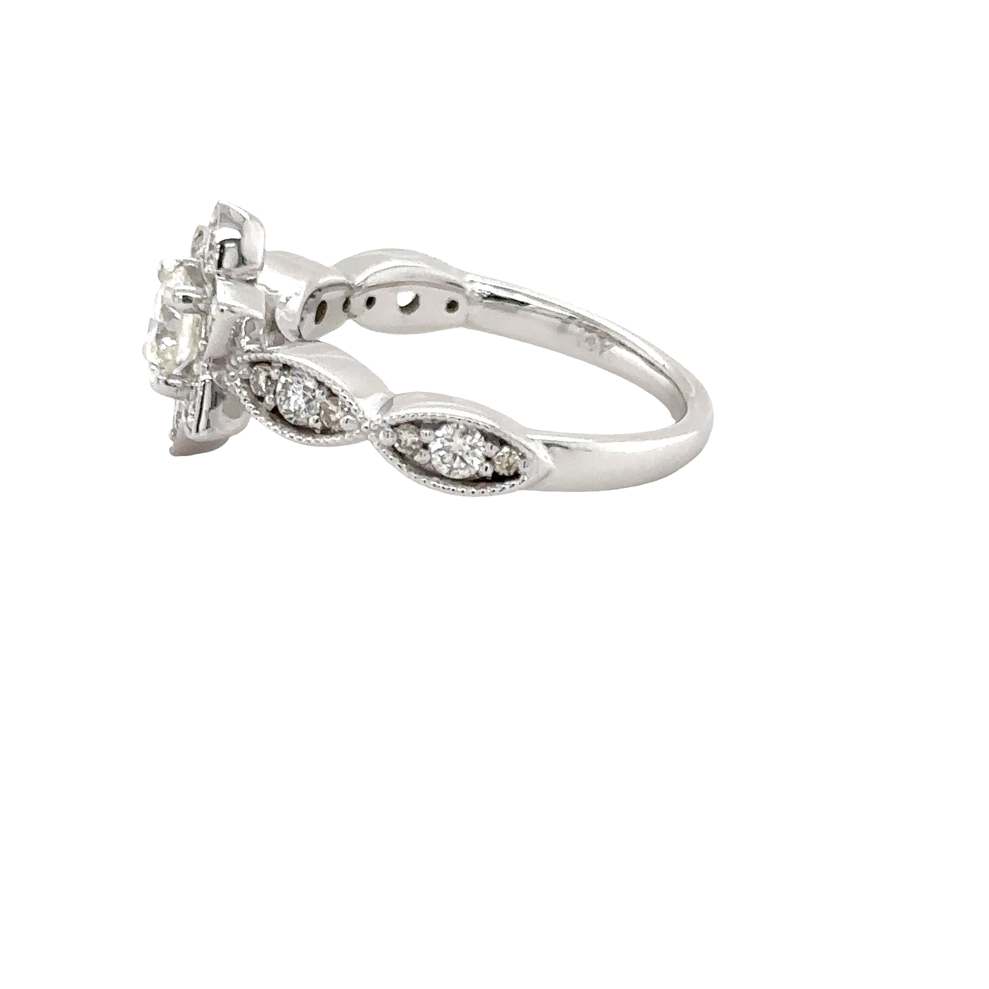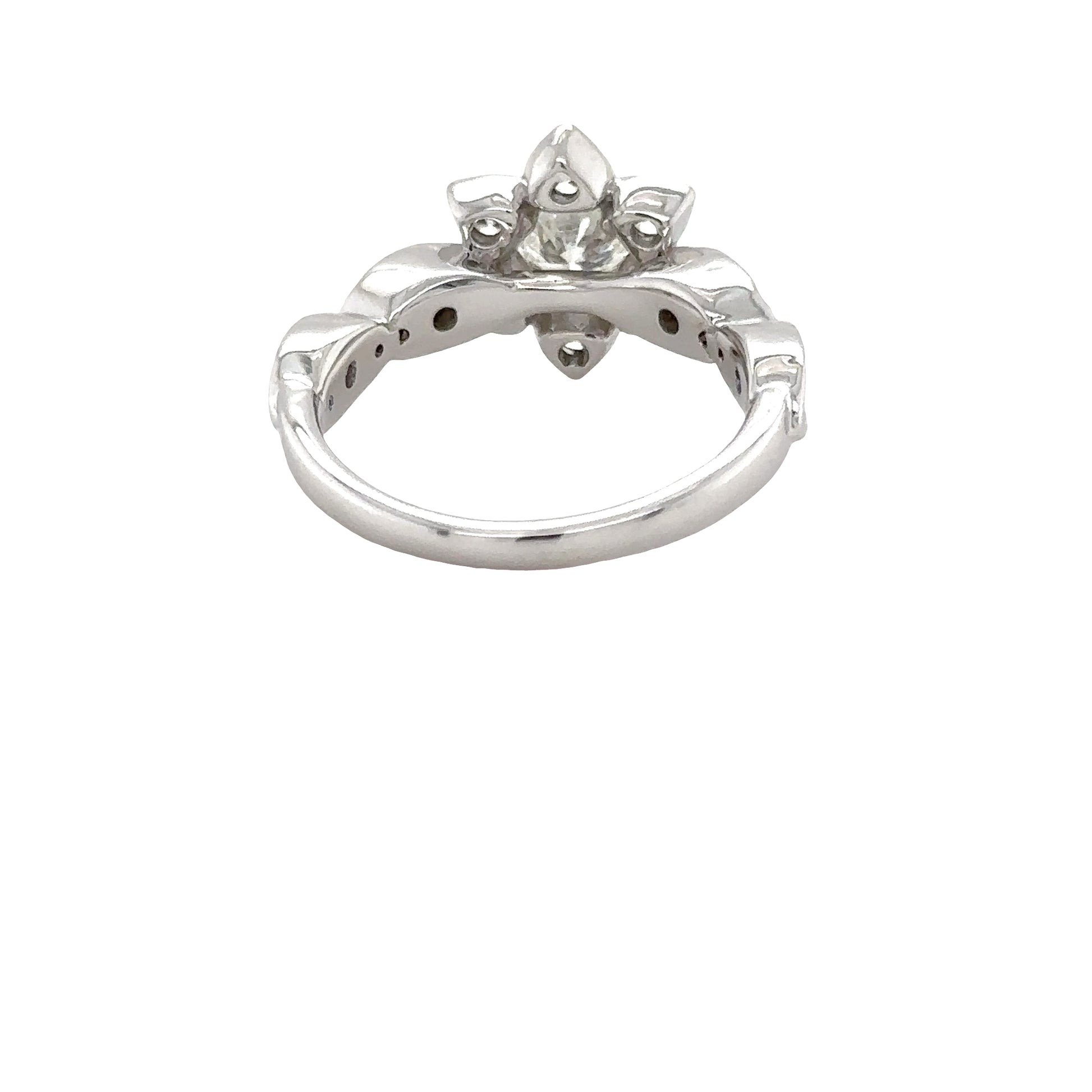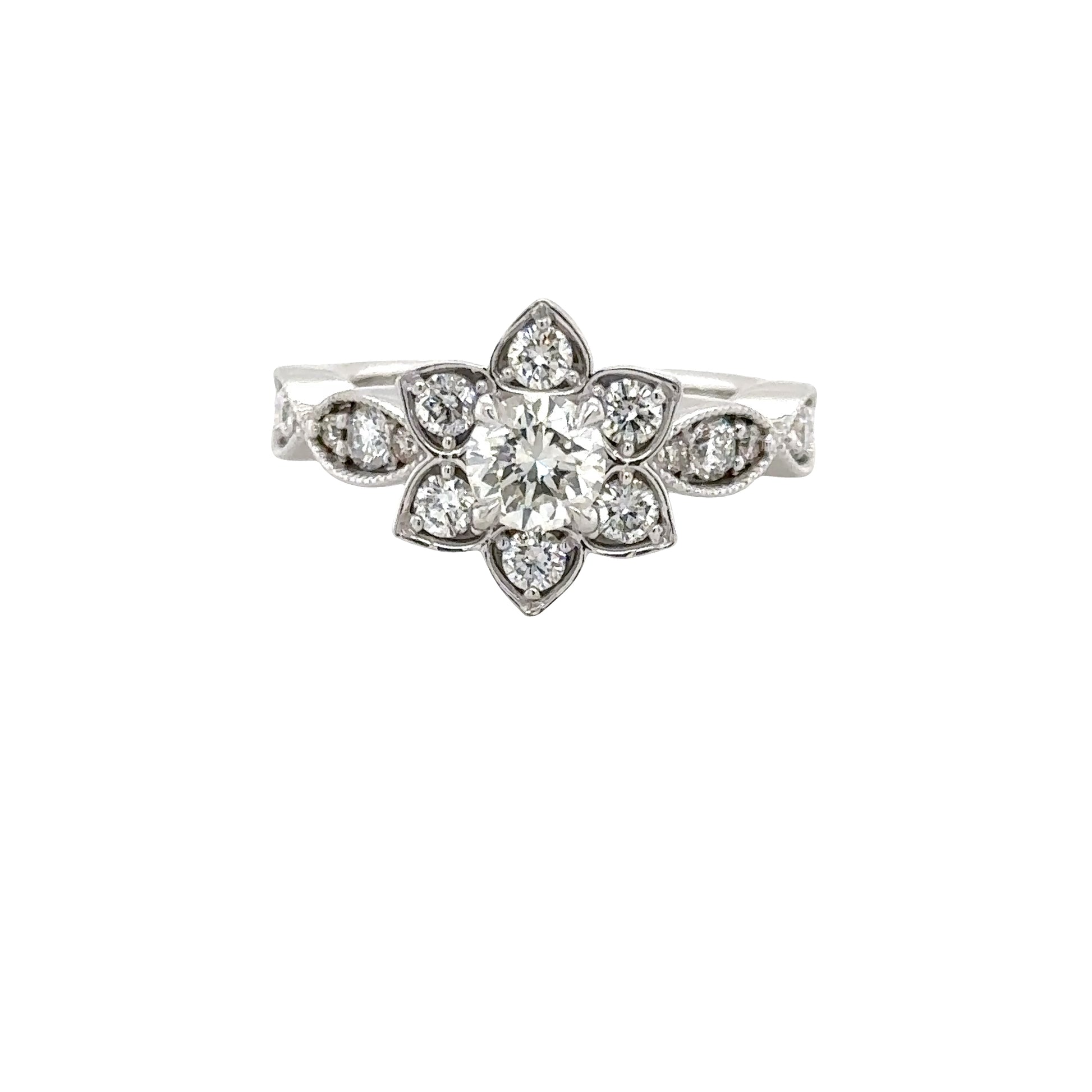 A delicately designed floral motif with a brilliant round-cut diamond at its heart, encircled by smaller diamonds.