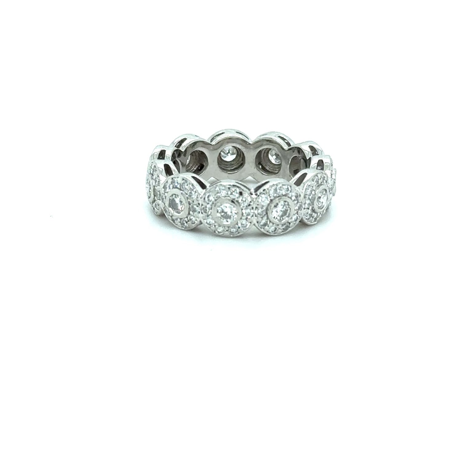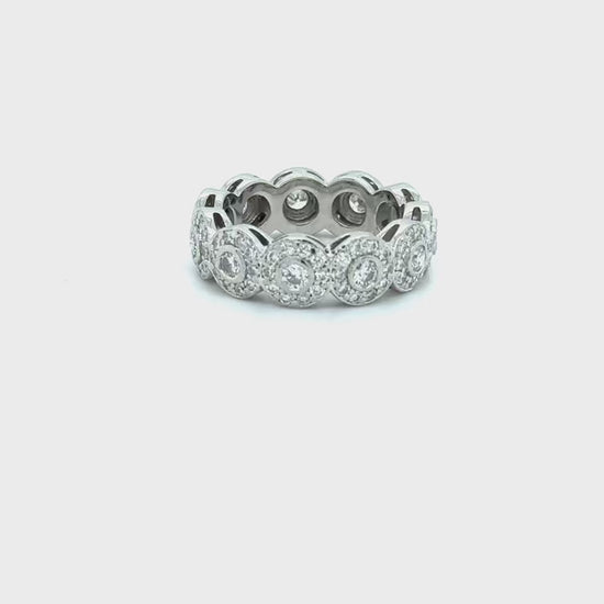 This engagement features mini round diamond halos for a unique and intricate style eternity band.