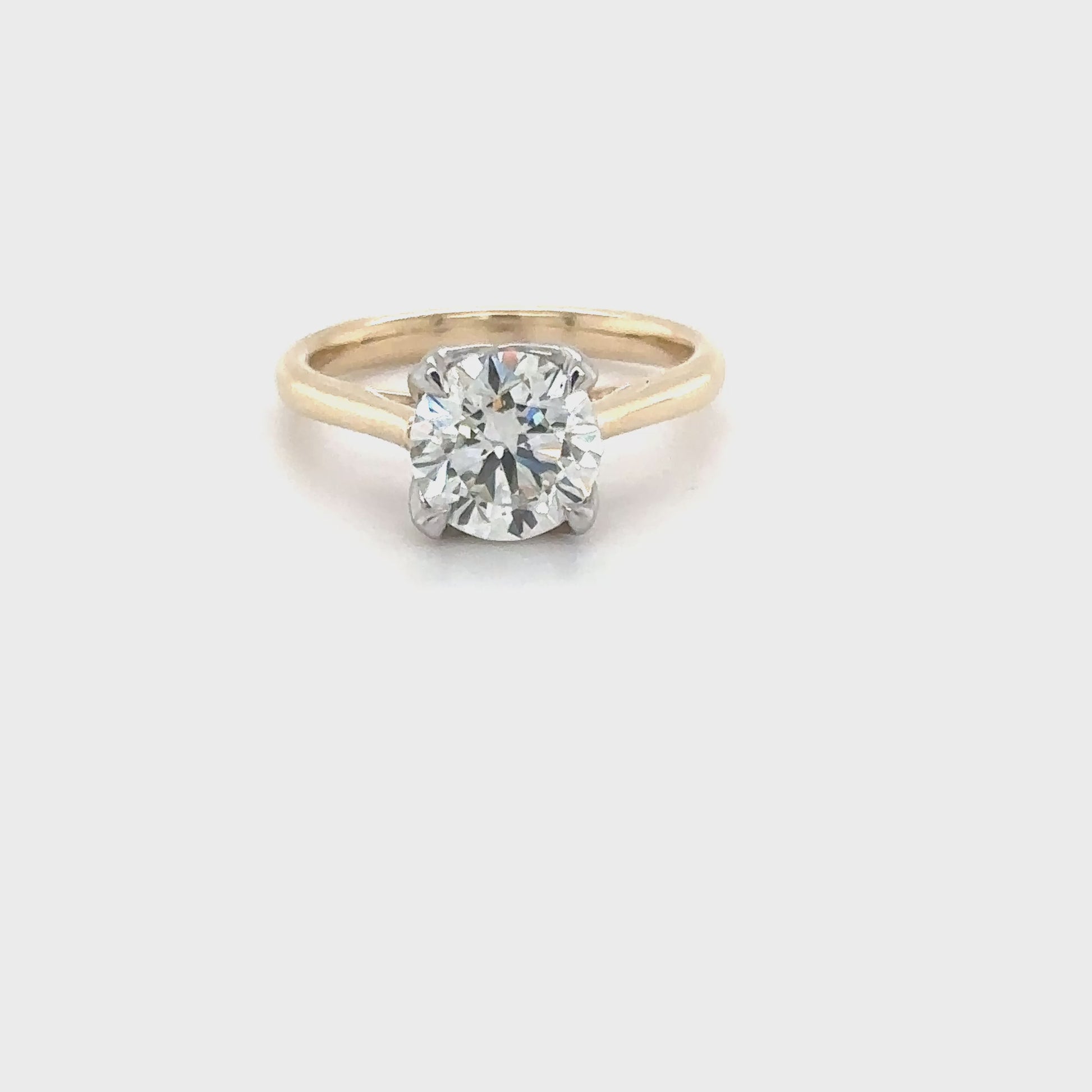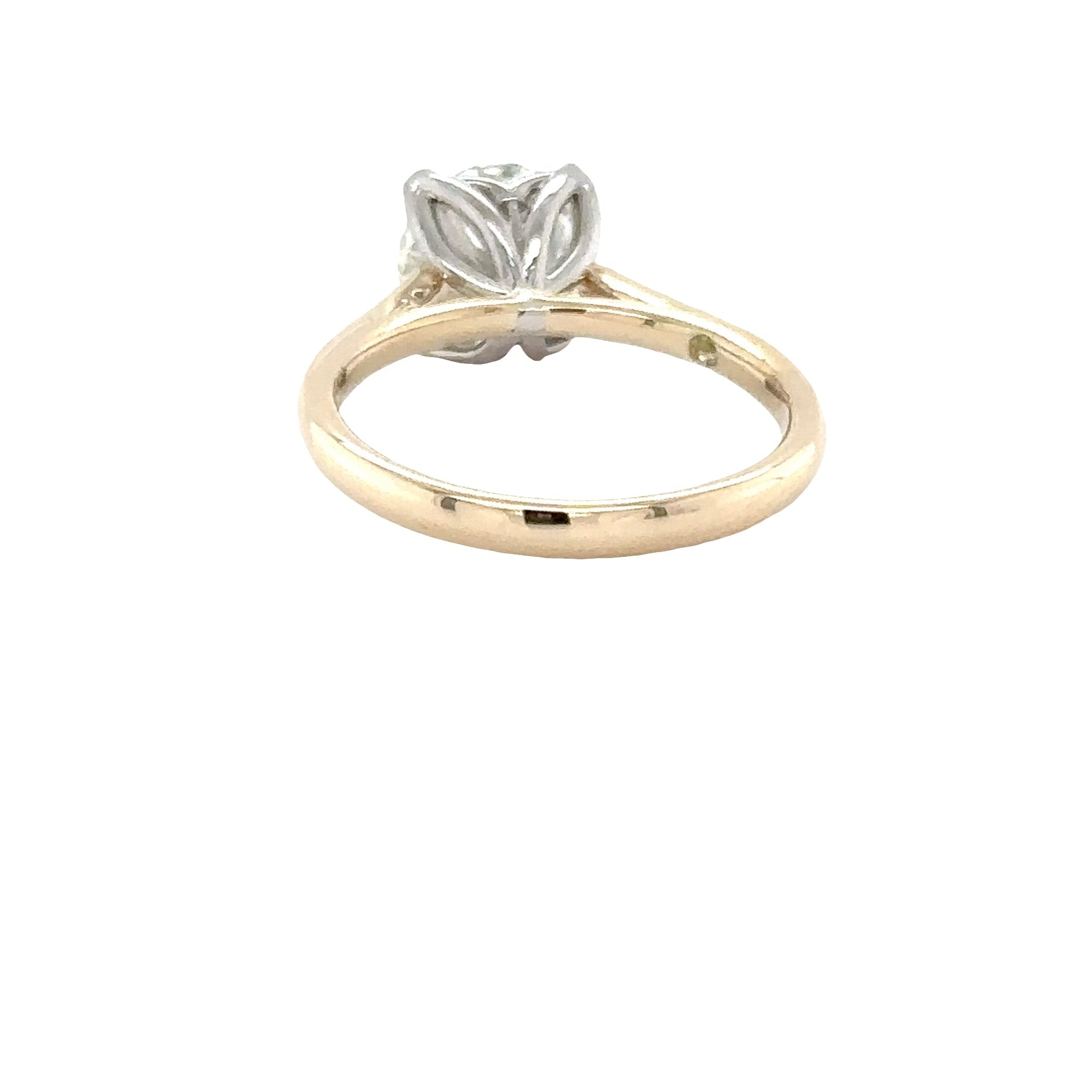 A brilliant round diamond set in a classic yellow gold band with a contrasting white gold petal design basket.