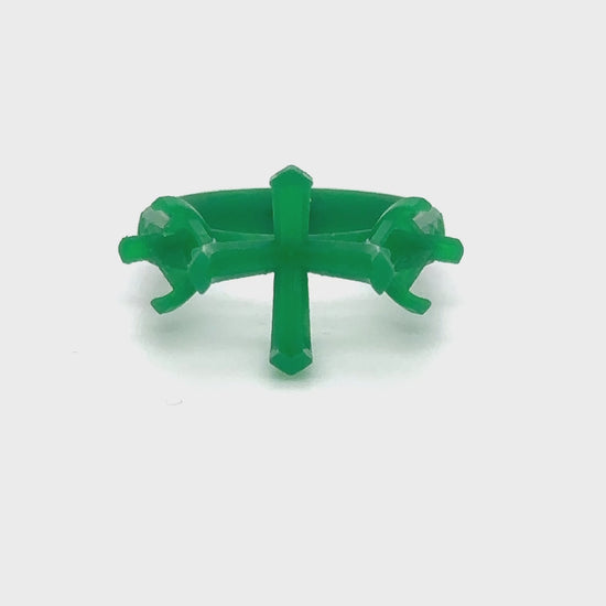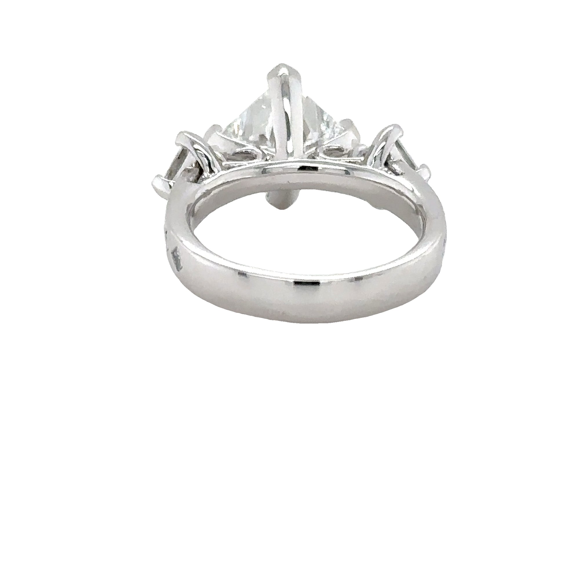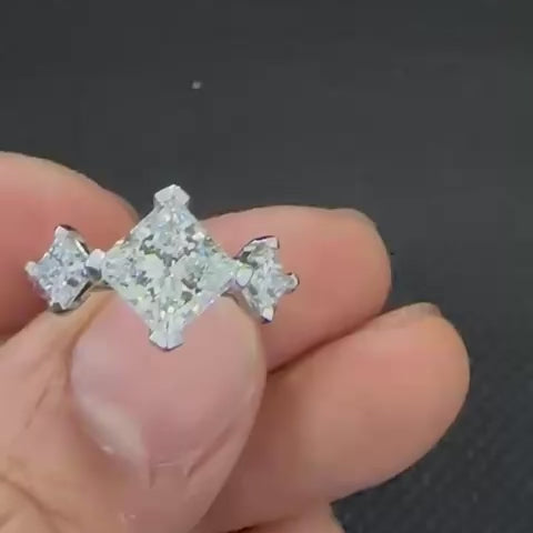 A brilliant princess-cut center stone, flanked by two sparkling round diamonds and diamond accents along the band.